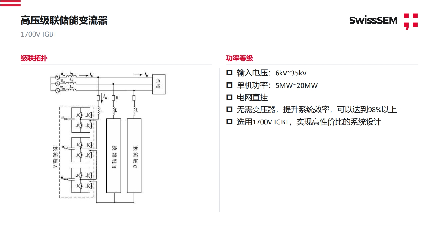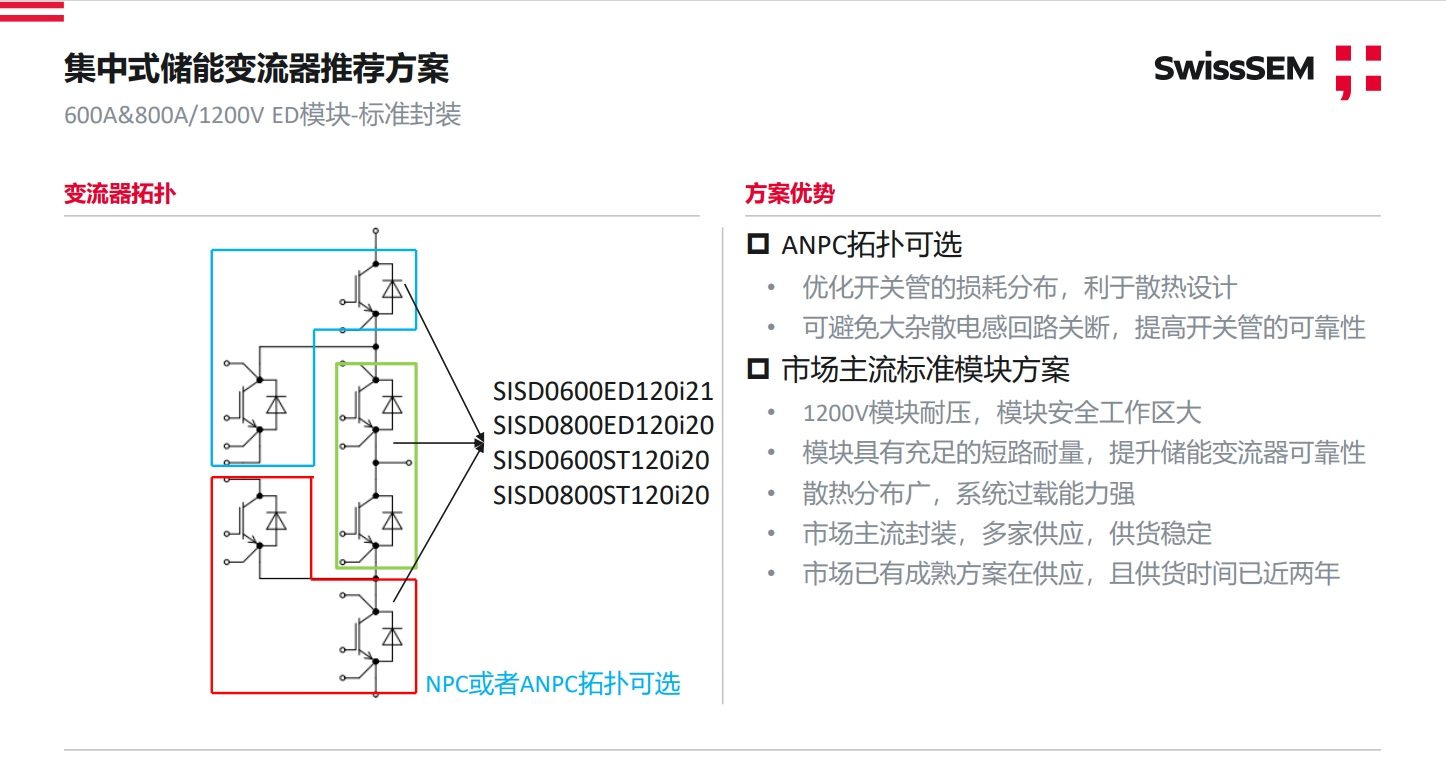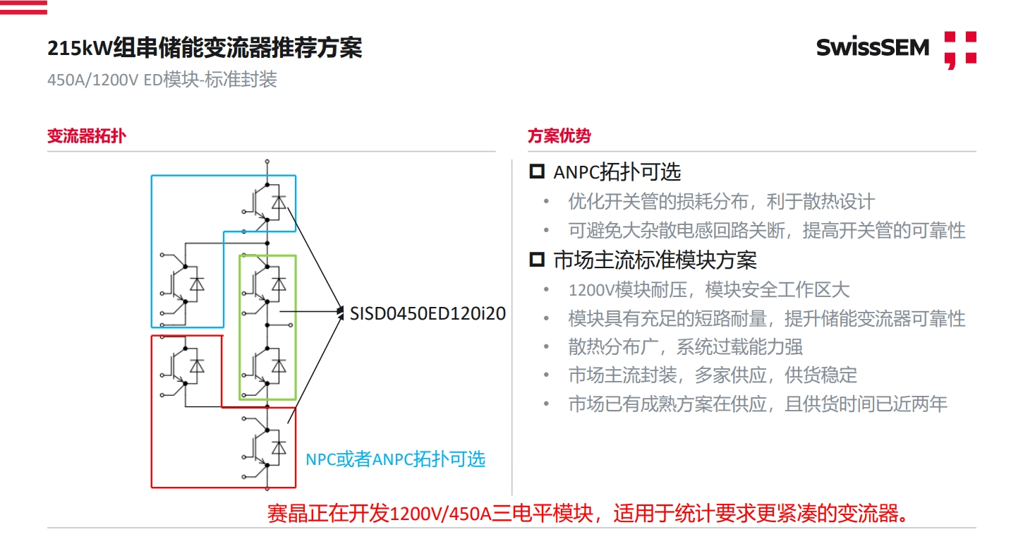 隨后重點(diǎn)闡述了賽晶產(chǎn)品在儲(chǔ)能變流器中解決方案。針對(duì)目前市場(chǎng)上的大功率組串變流器、集中式儲(chǔ)能變流器和高壓級(jí)聯(lián)儲(chǔ)能變流器,賽晶都有相應(yīng)產(chǎn)品可供選用。同時(shí),賽晶還針對(duì)市場(chǎng)的發(fā)展,會(huì)開發(fā)新型封裝的功率模塊,為客戶提供更佳的選擇。
