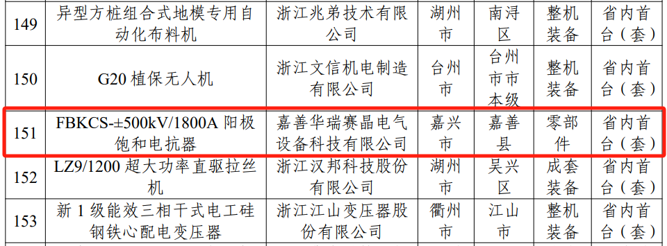 11月22日,浙江省經濟和信息化廳發布《2023年度浙江省首臺(套)裝備認定結果公示名單》。繼獲得2021年浙江省首臺(套)裝備后,賽晶科技成員企業 嘉善華瑞賽晶電氣 設備科技有限公司(以下簡稱:嘉善賽晶)自主研發的“FBKCS-±500kV/1800A陽極飽和電抗器”被授予“2023年度浙江省首臺(套)裝備”。