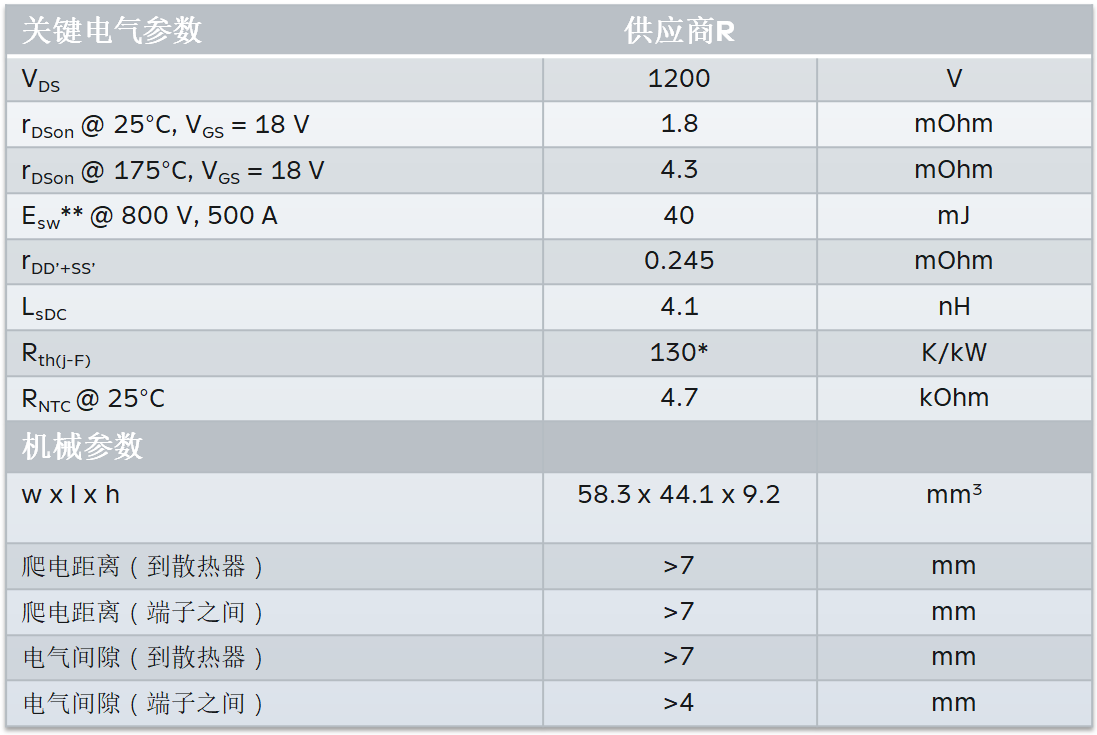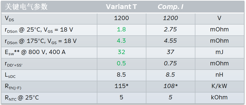 EVD封裝SiC模塊(1200 V)與業界頭部企業相同規格封裝模塊對比主要參數