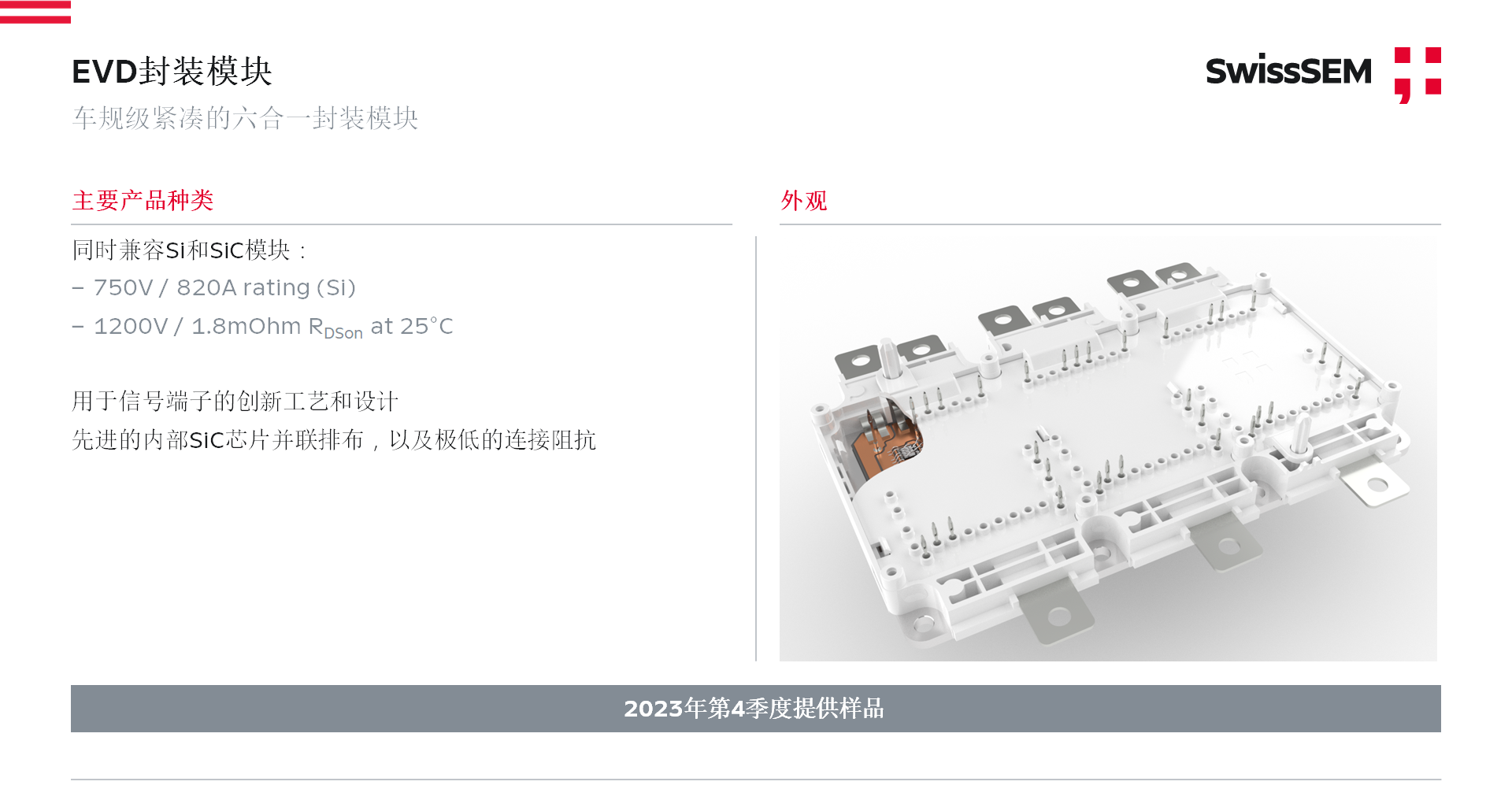 EVD封裝模塊是賽晶車規級緊湊的六合一封裝模塊,主要產品種類可同時兼容Si和SiC模塊,采用信號端子的創新工藝和設計,并具有先進的內部SiC芯片并聯排布,以及極低的連接阻抗。