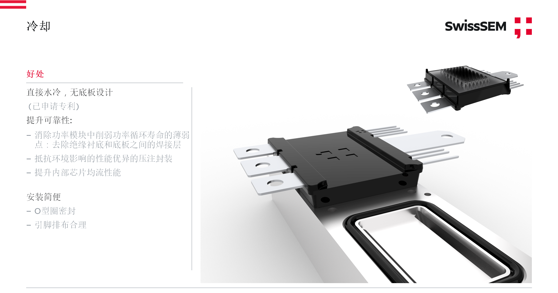 不僅如此,該模塊設計體積非常緊湊,有助于實現電驅的輕量化,在冷卻方面采用直接水冷,以及先進陶瓷材料降低熱阻和O型圈密封設計;在可靠性方面采用壓注模封裝,提高對環境友好性,并保證更好的功率循環壽命。此外,該模塊還采用了無銅底板技術,避免了銅底板和AMB(絕緣基片)之間大面積焊接層,以實現更高的功率循環壽命和更低的熱阻。同時,還具有雜散電感非常小,適合SiC高速開關等特點。