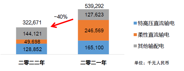 受到疫情等不利因素的影響,包括特高壓直流輸電工程及柔性直流輸電工程在內的高壓直流輸電領域,電網公司原規劃于2022年多個項目均未啟動。這導致本集團高壓直流輸電相關銷售收入,較2021年大幅下降57%。雖然其他輸配電領域銷售收入有所增長,但電網輸配電領域綜合銷售收入,較2021年仍然下降40%。