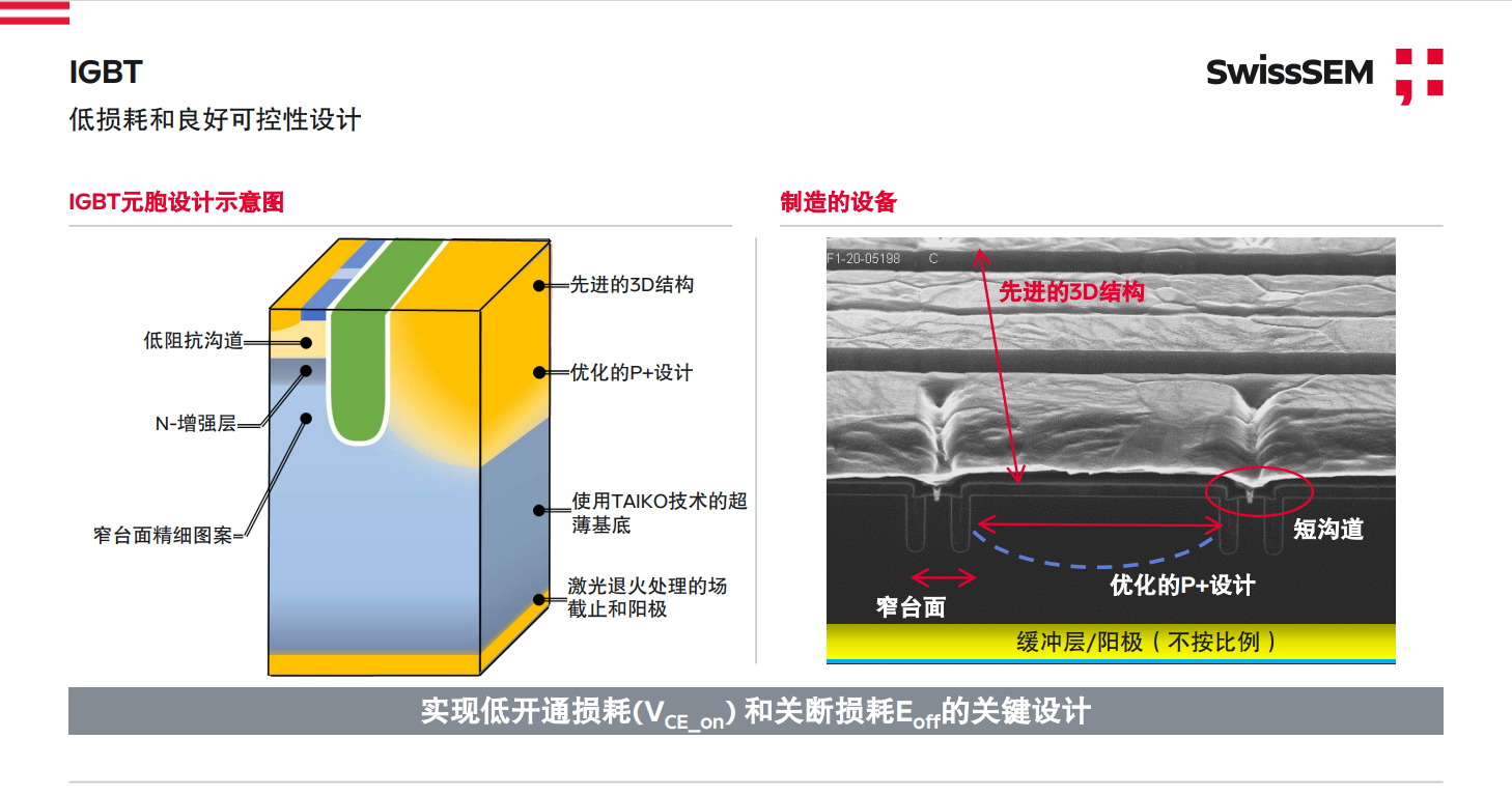 i20 IGBT芯片,采用FS-TRENCH結構、多項國際前沿優(yōu)化設計,具有低阻抗短溝道、先進的3D結構、N-增強層,使用TAIKO技術超薄基底、優(yōu)化的P+設計,以及窄臺面精細圖案、激光退火處理的場截止層和陽極等優(yōu)勢,多項國際前沿優(yōu)化設計帶來超低導通損耗和關斷損耗。