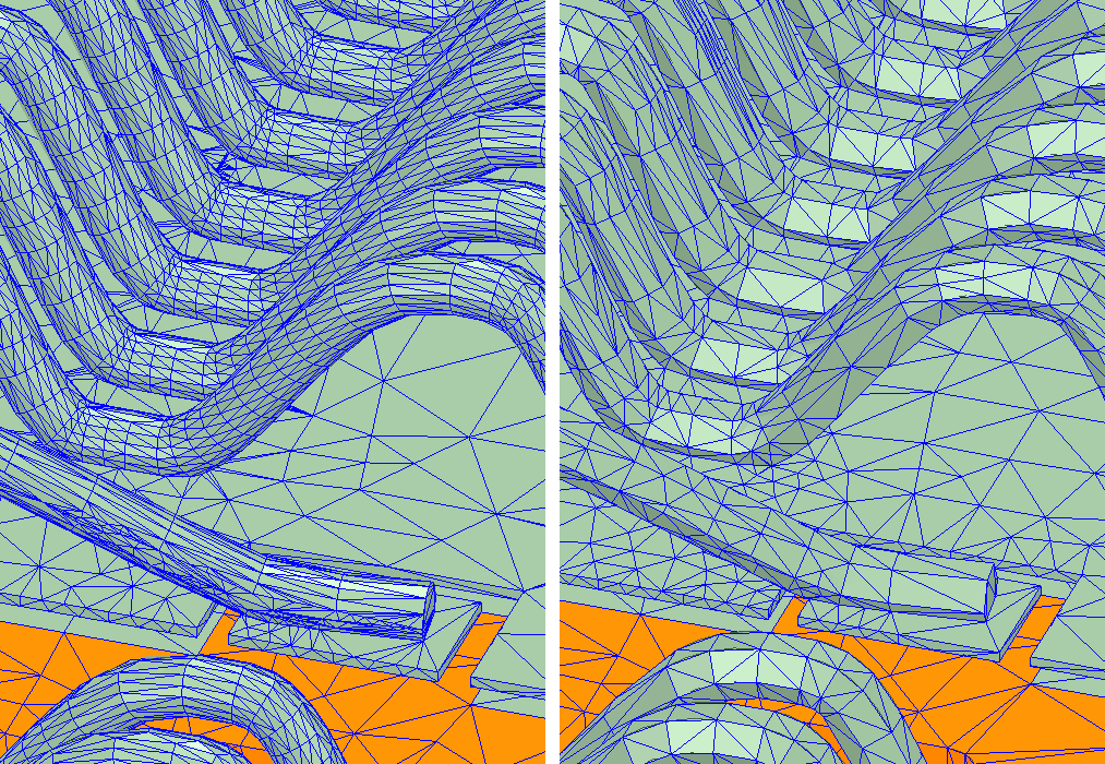 圖2:基于Ansys Q3D對具有圓形和六角形橫截面的鍵合線進(jìn)行網(wǎng)格剖分的結(jié)果