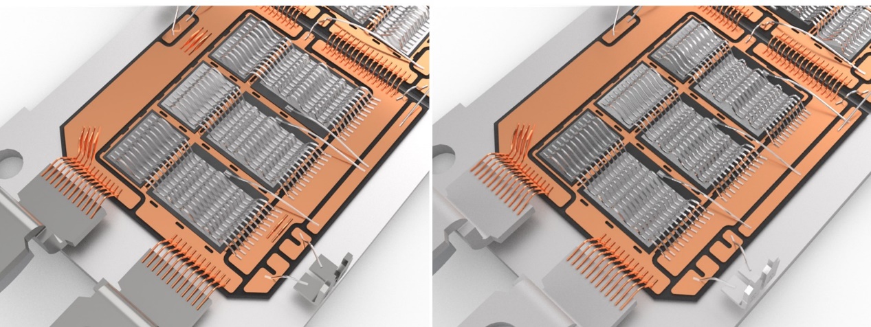 該軟件可作為功能強(qiáng)大且價(jià)格合理的Rhino3D CAD平臺的插件。創(chuàng)建鍵合線布局也僅僅需要CAD建模的基本技能。簡短的介紹工作流程的培訓(xùn)視頻可以指導(dǎo)用戶在短時(shí)間內(nèi)創(chuàng)建第一條導(dǎo)線布局。3D模型完成后,可以將其導(dǎo)出為許多行業(yè)標(biāo)準(zhǔn)的CAD格式,或轉(zhuǎn)換為帶有鍵合點(diǎn)坐標(biāo)的2D工程圖。借助Rhino3D強(qiáng)大的渲染功能,用戶可以輕松地創(chuàng)建功率模塊布局的逼真圖像(如下圖4所示)。