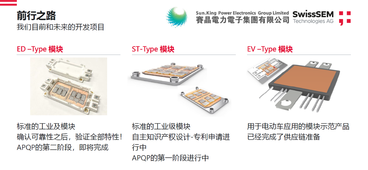 不僅由SwissSEM獨(dú)家研發(fā)并已在申請(qǐng)專利的ST-Type模塊,讓大家眼前一亮。另一方面,針對(duì)電動(dòng)汽車領(lǐng)域的第7代微溝槽技術(shù)i21芯片,使用新材料SiC的M2x芯片,以及具有獨(dú)到技術(shù)的EV-Type模塊,也讓人感受到了SwissSEM對(duì)于電動(dòng)汽車領(lǐng)域的高度重視和出色技術(shù)。