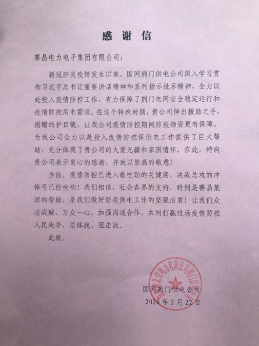 此外,子公司武漢朗德電氣有限公司代表賽晶集團,向國家電網湖北省電力公司荊門供電公司(以下簡稱國網荊門公司)捐贈1000個護目鏡,助力湖北荊門供電安全。