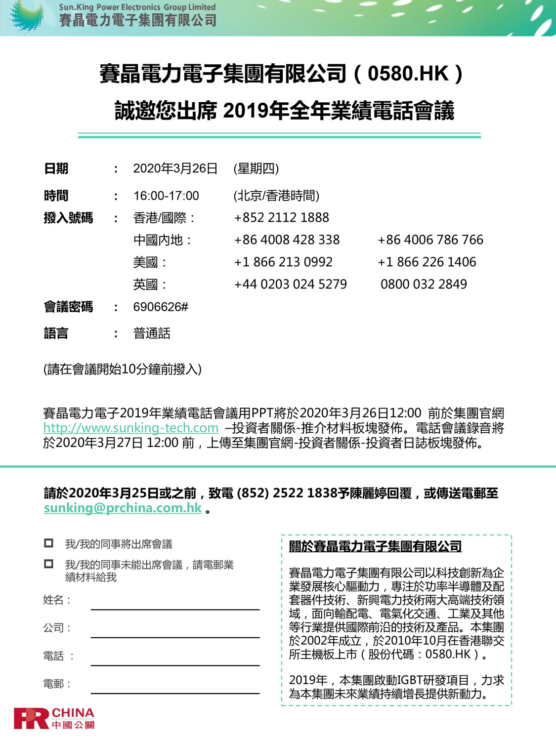 賽晶電力電子集團有限公司(0580.HK),將于2020年3月26日 16:00-17:00 召開2019全年業(yè)績電話會議。
