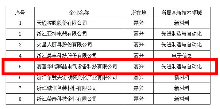 為加快推進高新技術產業高質量發展,著力培育一批高新技術骨干企業做大做強,根據《浙江省創新型領軍企業培育工作方案》(浙科發高〔2016〕206 號)和《關于組織開展 2019 年浙江省創新型領軍企業培育申報工作的通知》,浙江省科學技術廳公布2019 年度浙江省創新型領軍企業培育名單,嘉善華瑞賽晶電氣設備科技有限公司(以下簡稱:嘉善華瑞賽晶)榜上有名。