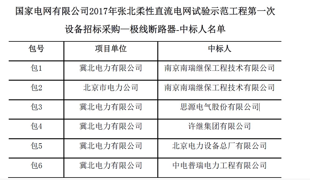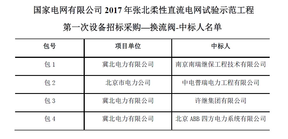 3月30日,國家電網(wǎng)公司發(fā)布2017年張北柔性直流電網(wǎng)試驗示范工程第一次設(shè)備招標采購中標公告。其中,南京南瑞繼保工程技術(shù)有限公司、思源電氣股份有限公司、許繼集團有限公司、中電普瑞電力工程有限公司等中標了高壓直流斷路器(極線斷路器);南京南瑞繼保工程技術(shù)有限公司、中電普瑞電力工程有限公司、許繼集團有限公司等中標了換流閥。