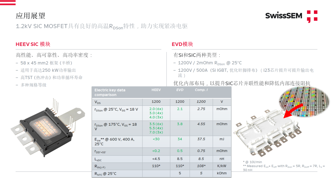 此外,采用此SiC MOSFET芯片,賽晶還推出了多規(guī)格、型號的車規(guī)級、高性能HEEV封裝、EVD封裝SiC模塊。
